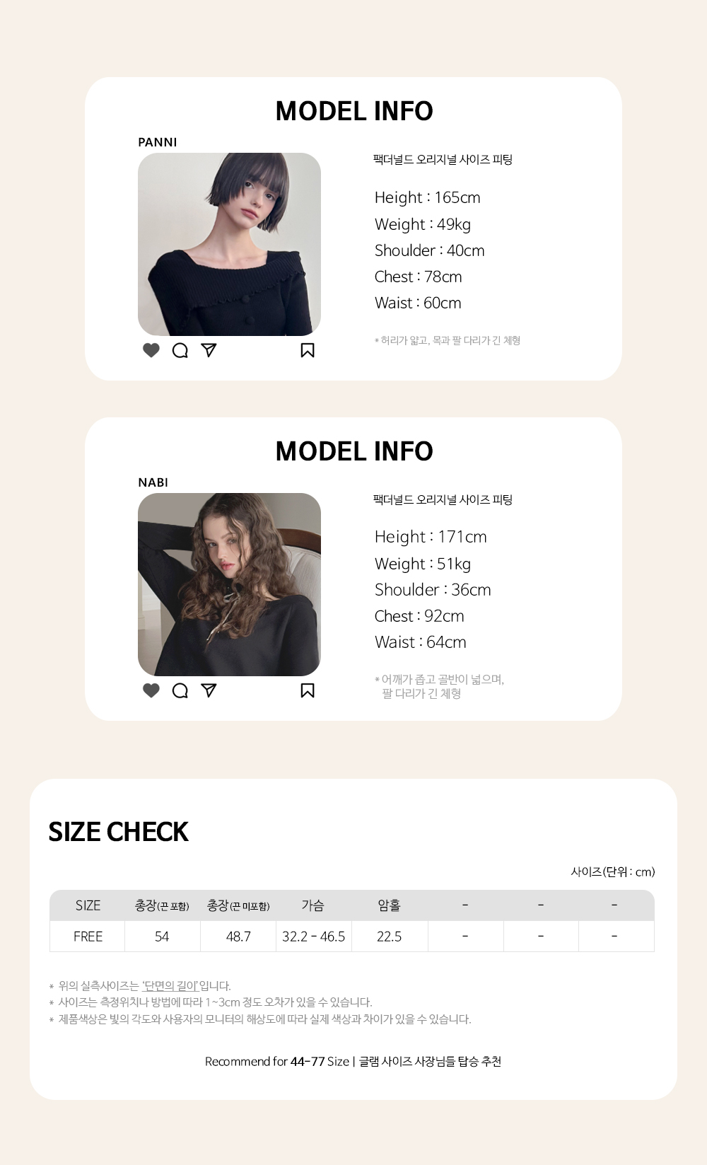 Recommend for 44 - 77 Size | 권장 사이즈는 최고 핏감 보일 수 있는 사이즈입니다.