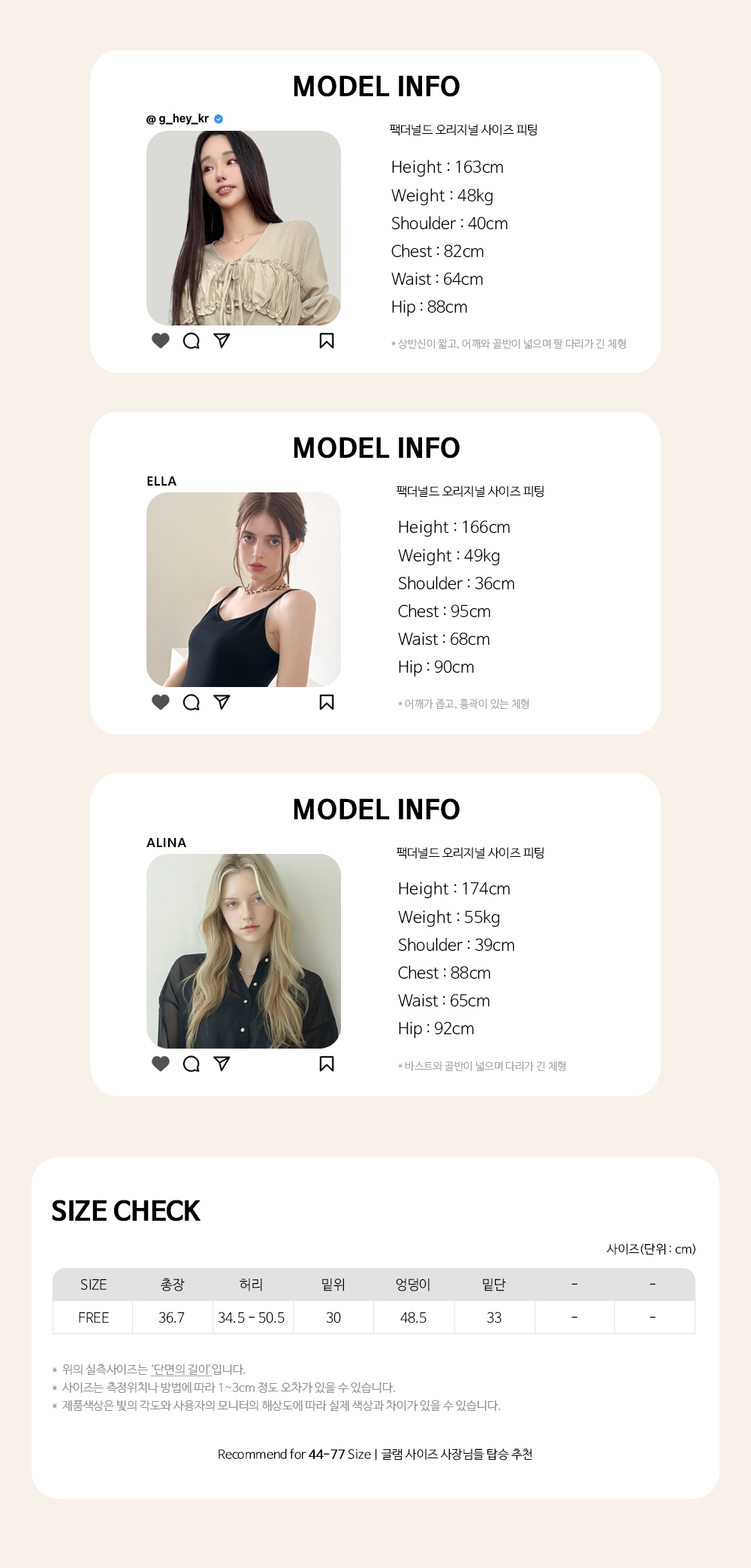 Recommend for 44 - 77 Size | 권장 사이즈는 최고 핏감 보일 수 있는 사이즈입니다.