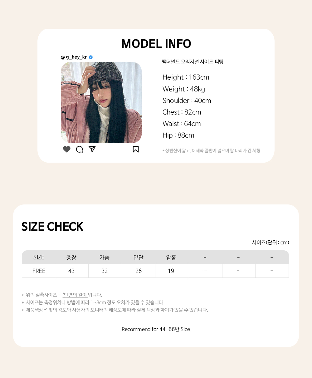 Recommend for 44 - 66반 Size 사이즈 | 권장 사이즈는 최고 핏감 보일 수 있는 사이즈입니다.