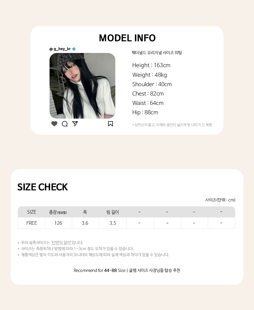 Recommend for 44 - 88 Size 사이즈 | 권장 사이즈는 최고 핏감 보일 수 있는 사이즈입니다.