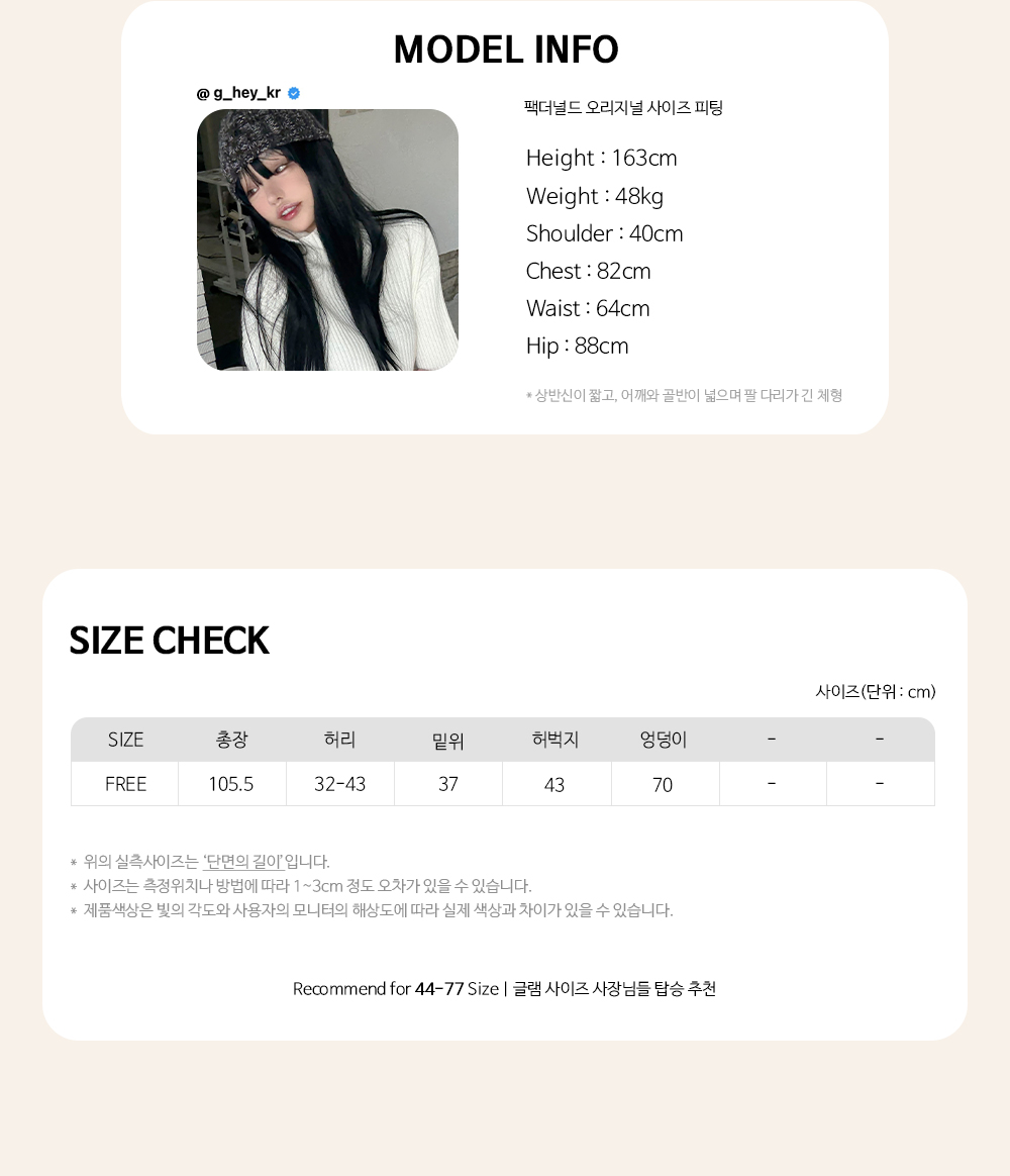 Recommend for 44 - 77 Size | 권장 사이즈는 최고 핏감 보일 수 있는 사이즈입니다.